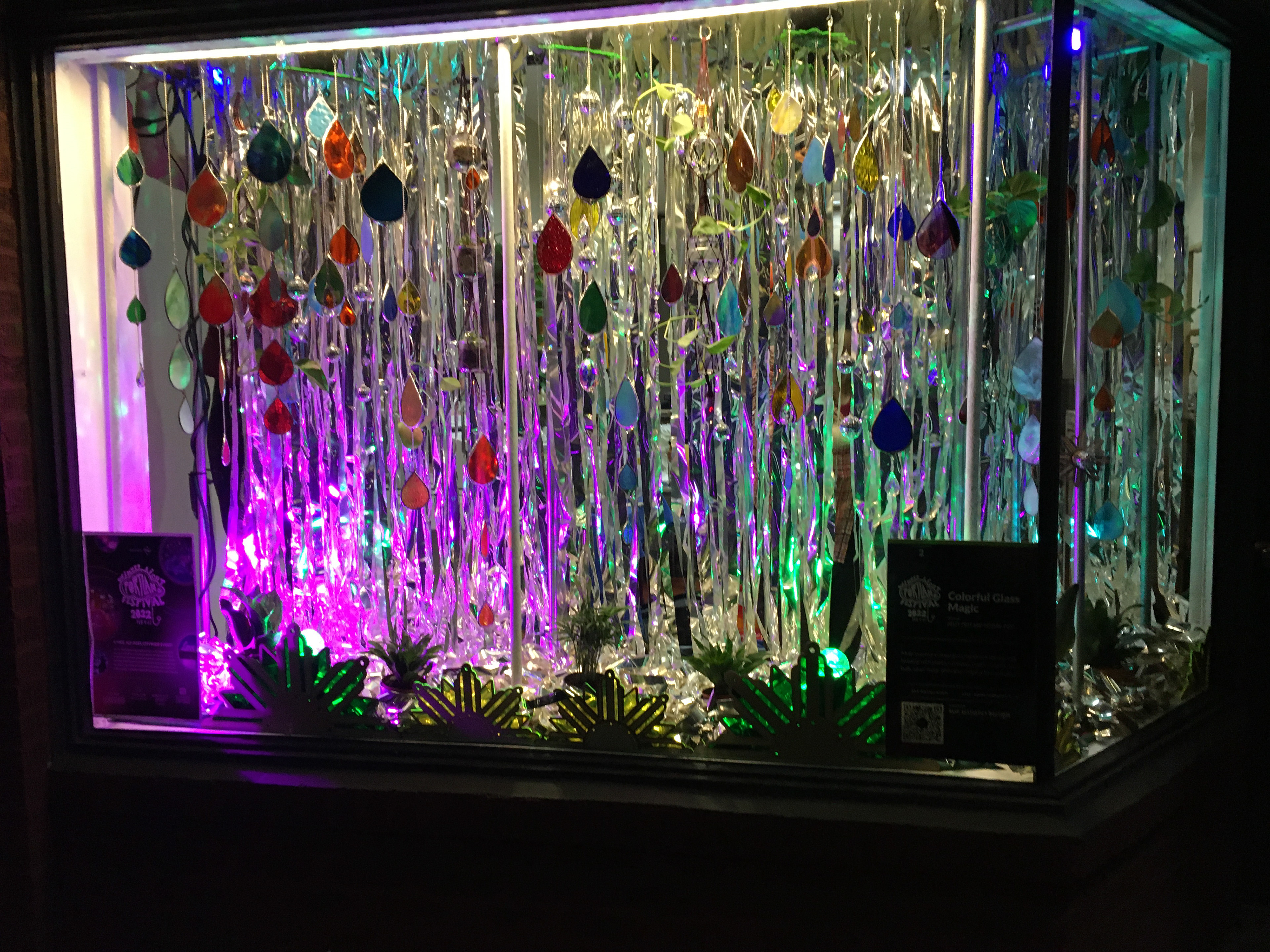 Around 120 glass raindrops made from various stained glass colors were hung from a simple metal frame with metal chain. A silver mylar backdrop added texture and depth, and the display wrapped around the side into the door nook. The base featured laser-cut designs with green plexiglass backing, and lights along the base created a watery effect. Pin spots from above made the reflections dance, bouncing off spinning disco balls and natural plants scattered throughout. The contrast between nature’s greenery and reflections, alongside the more rigid lines of silver and plexiglass, added a unique touch.